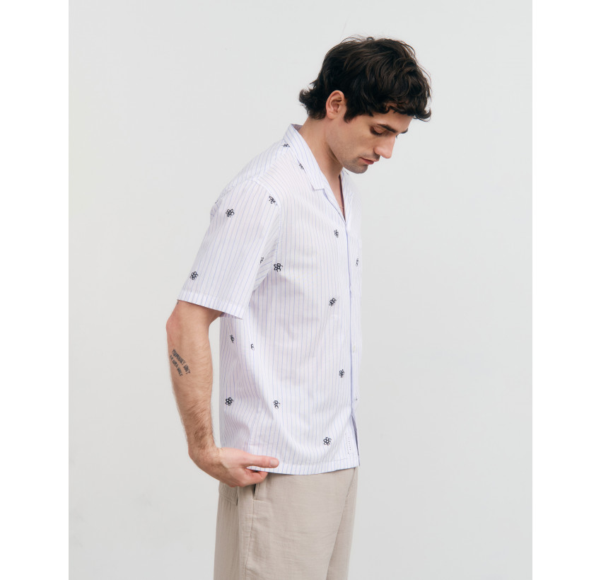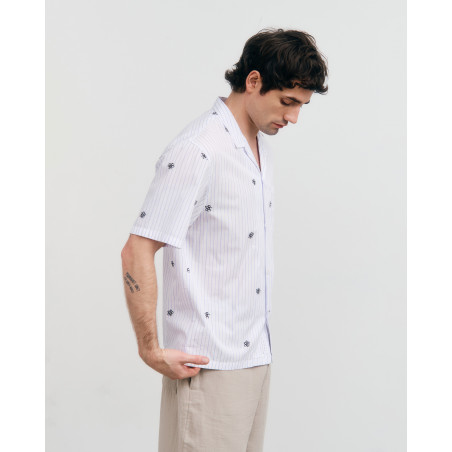 Lockeres Hemd mit Bowling-Kragen und kurzen Ärmeln. Material: 100% Bio-Baumwolle. Fair hergestellt in Portugal.
