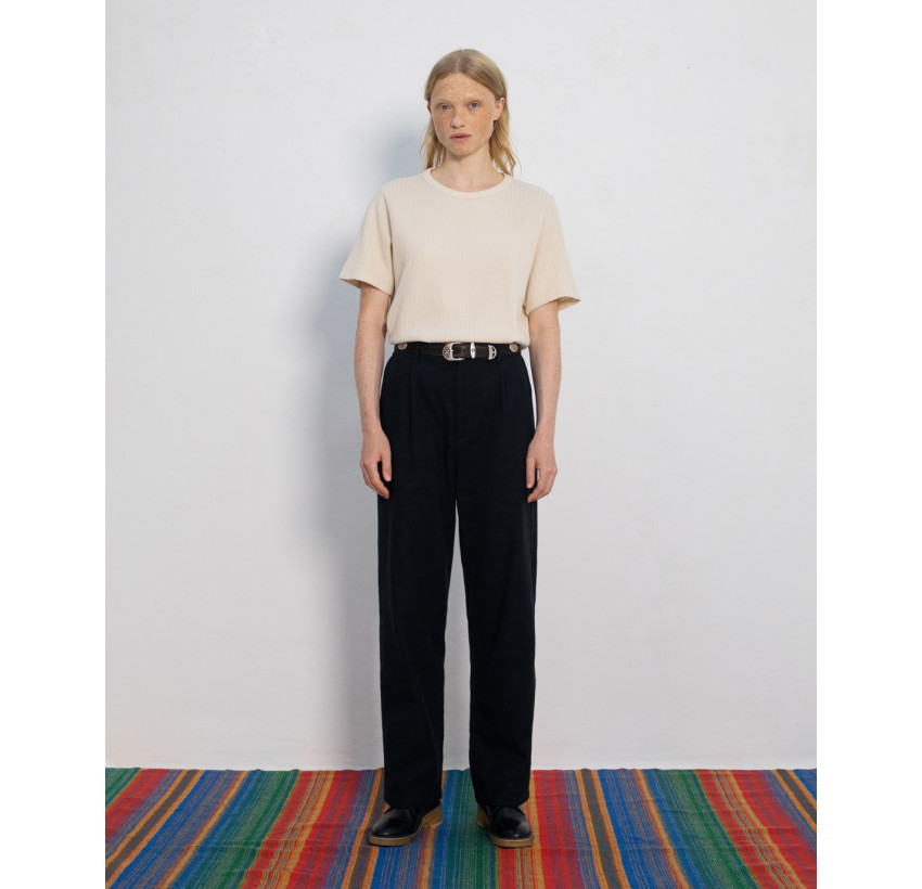 Klassische Bundfaltenhose aus super weichem Baumwollflannel. Die Hose ist hoch geschnitten und hat ein weiteres Bein. Material: 100% Bio-Baumwolle. Fair hergestellt in Portugal.