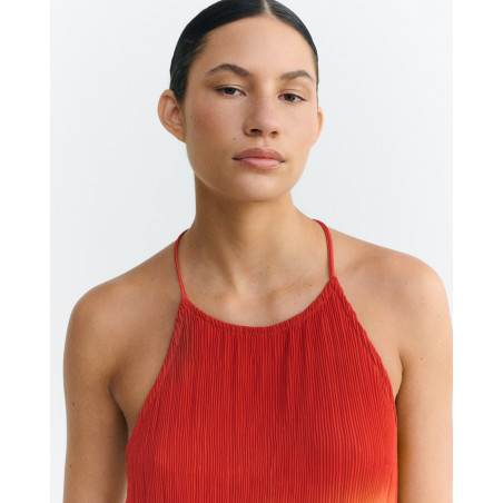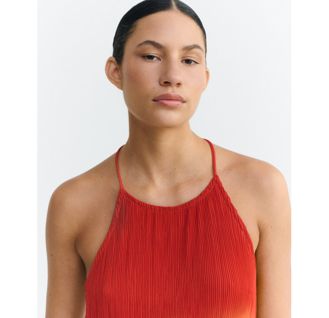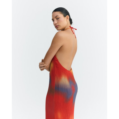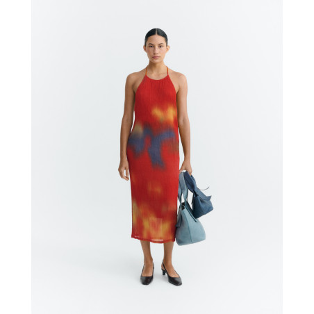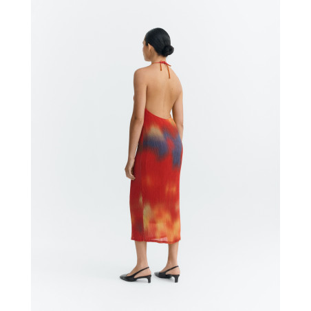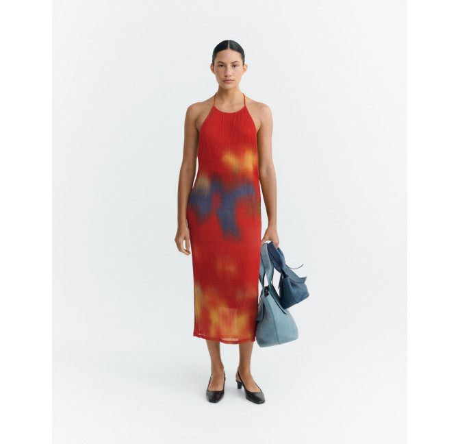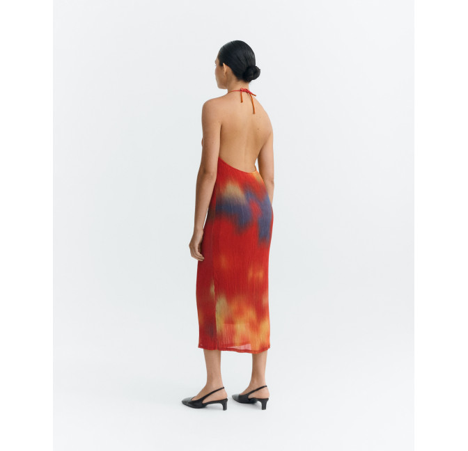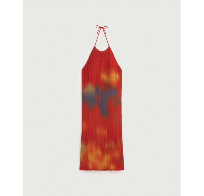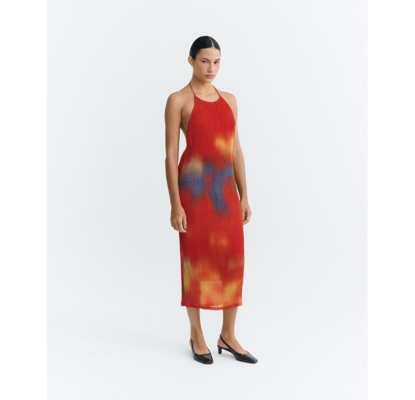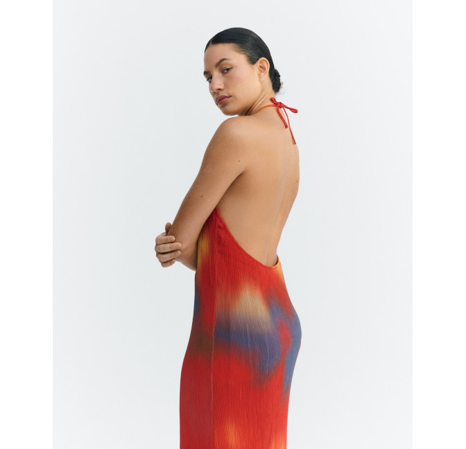 Knielanges Kleid mit Neckholder aus einem leichten, plissierten Stoff mit Allover-Print. Material: 100% Polyester (recycelt). Fair hergestellt in China.