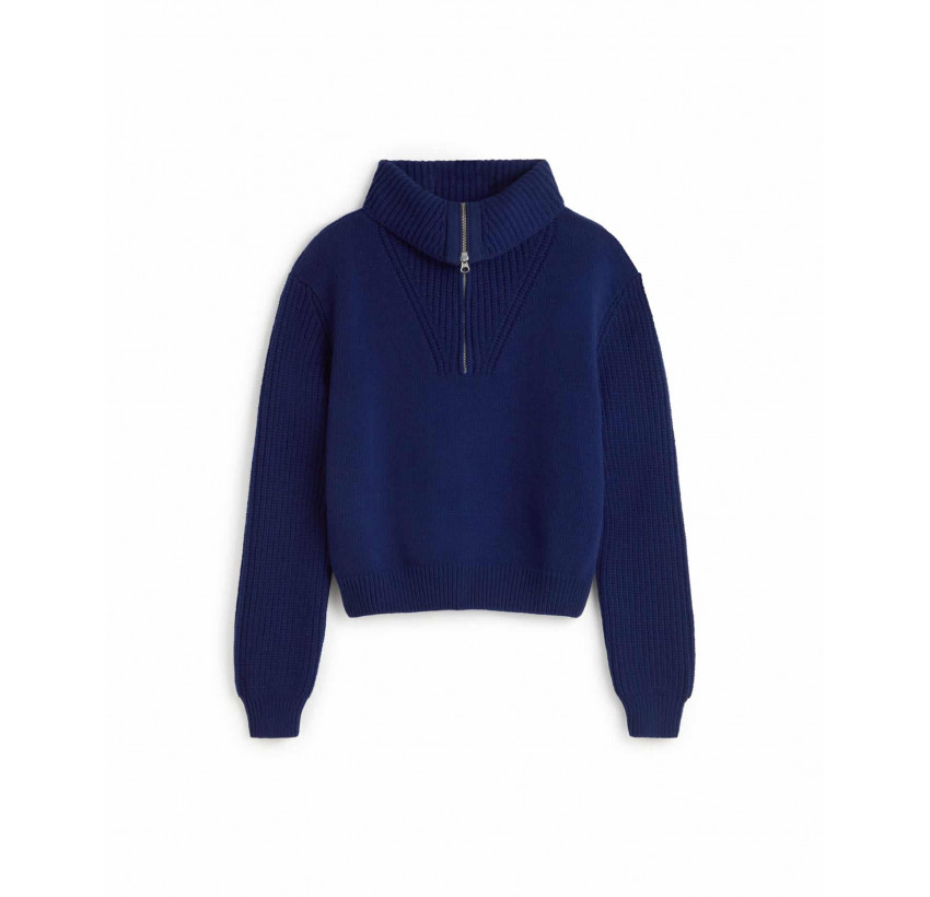 Troyer mit hohem Kragen und leicht verkürzter Passform. Material: 100% Wolle. Fair hergestellt in Spanien.