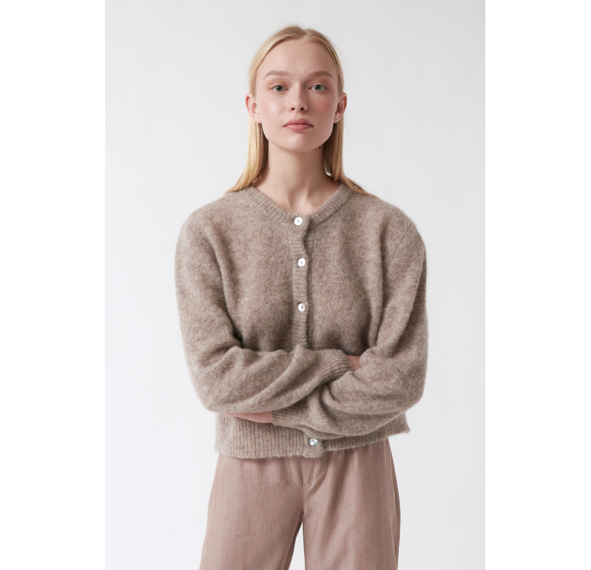 Hochwertiger, locker geschnittener Cardigan aus einem extra-weichen Alpaka-Woll-Mix. Mit Perlmutt-Knöpfen. Material: 55% Baby-Alpaka-Wolle, 20% Extrafeine Wolle, 25% Polyamid (recycled). Fair hergestellt in Barcelona, Spanien.