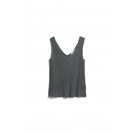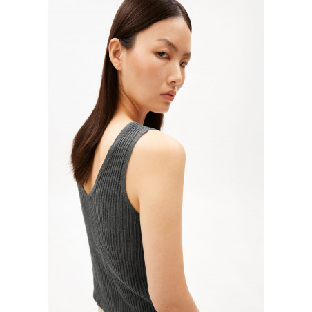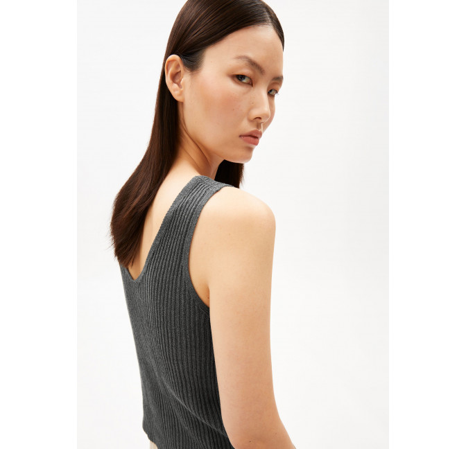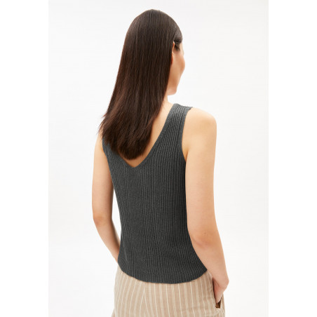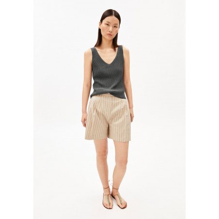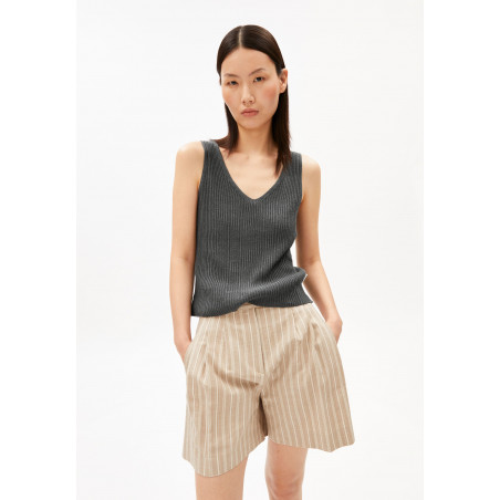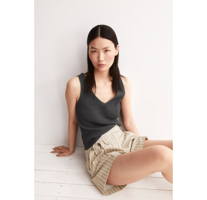 Lockeres Stricktop mit V-Ausschnitt vorne und hinten, aus Leinen-Mix. Material: 40% Leinen, 30% EcoVero® Viskose, 30% Bio-Baumwolle. Fair hergestellt in der Türkei.