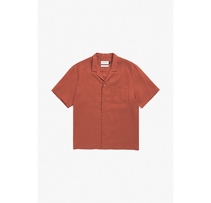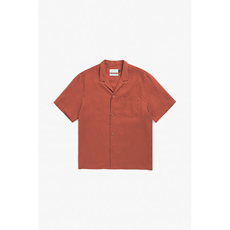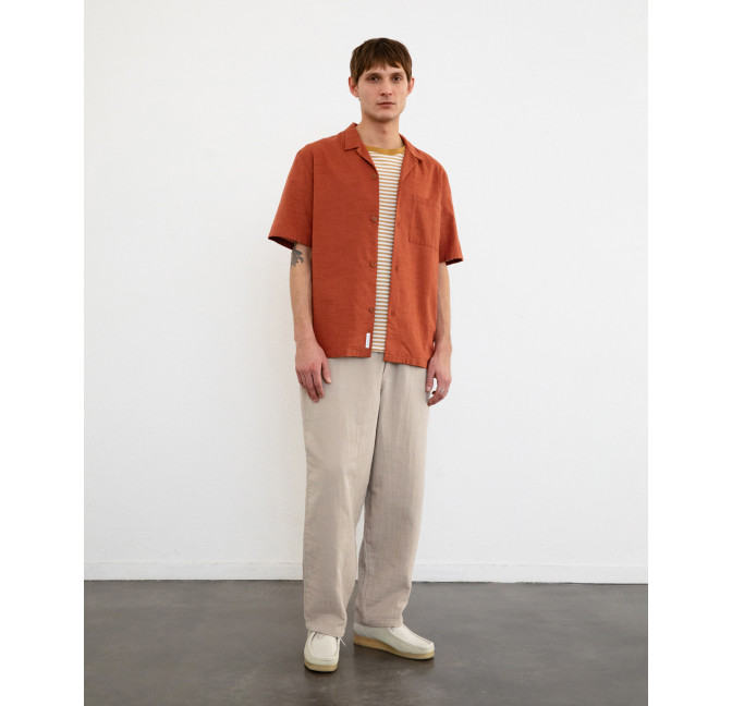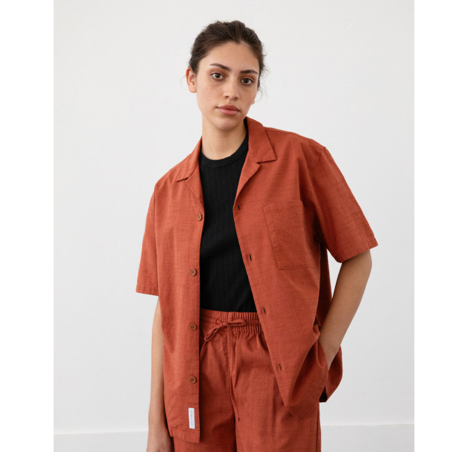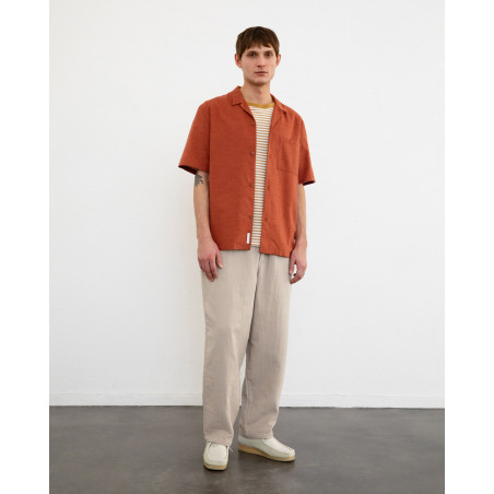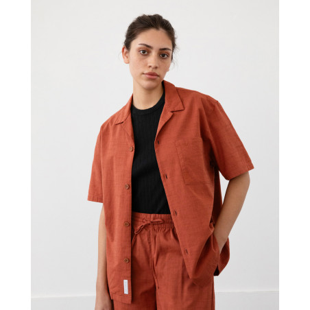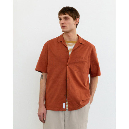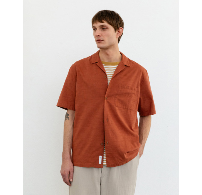 Lockeres Hemd mit Bowling-Kragen und kurzen Ärmeln. Material: 100% Bio-Baumwolle. Fair hergestellt in Portugal.