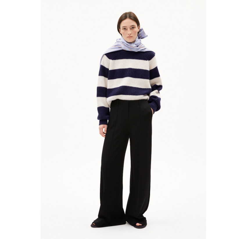 Die perfekte Mischung aus bequem und gut angezogen: Hoch geschnittene Hose mit sehr weitem Bein, mit Gumibund und Gürtelschlaufen sowie eingenähter Biese. Regular Fit. Material: 82% EcoVero® Viskose, 16% Polyamid (recycled), 2% Elasthan. Fair hergestellt in Portugal.