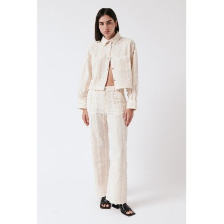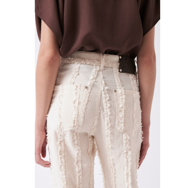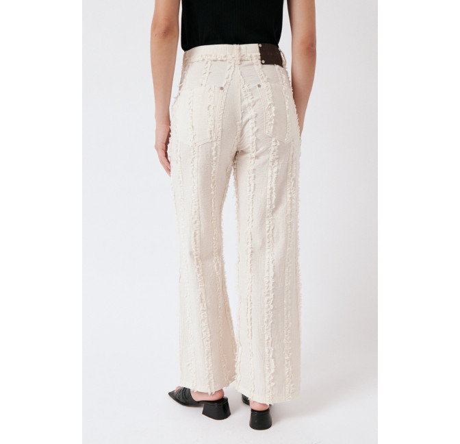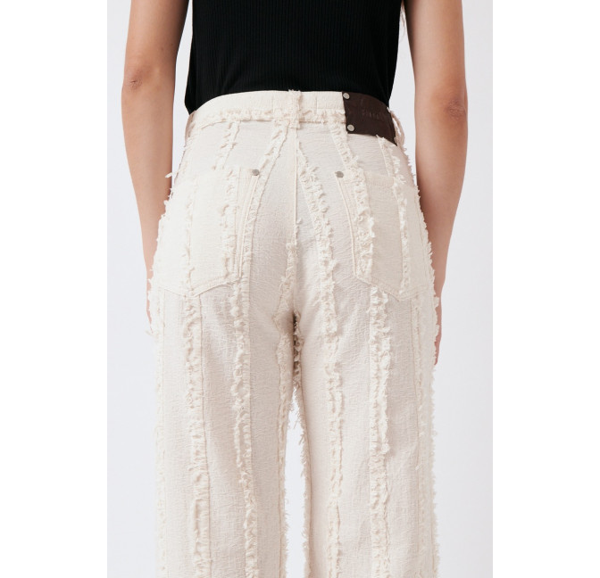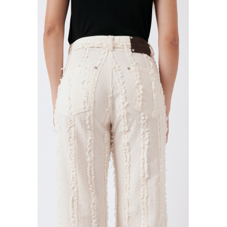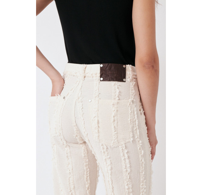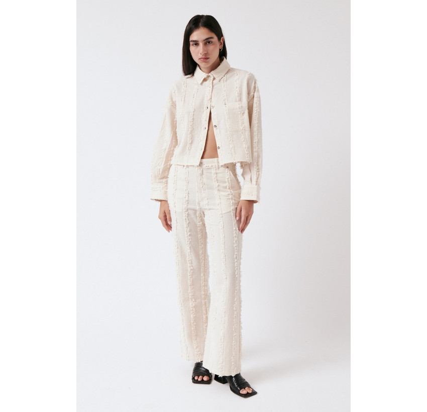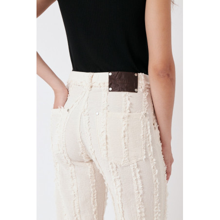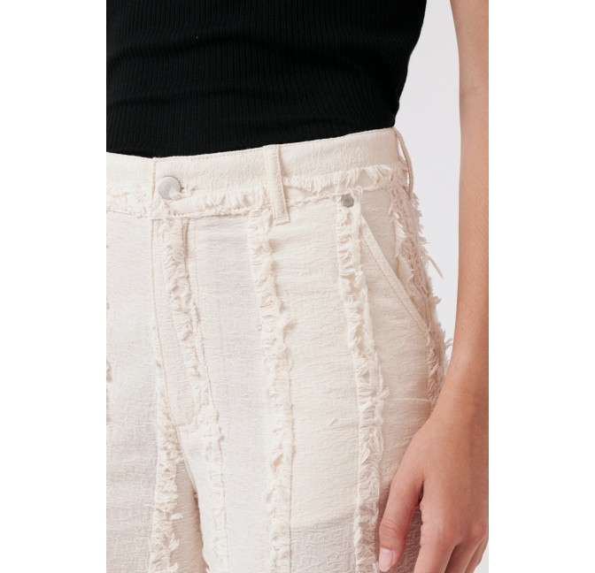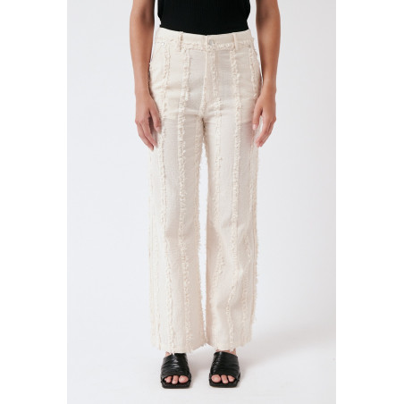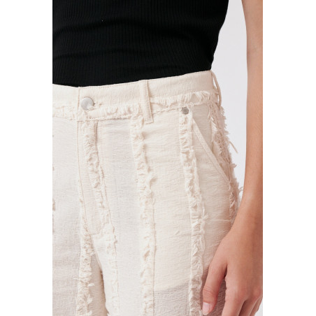 Gerade geschnittene Hose aus einem besonderen, strukturierten und gefransten Baumwollstoff. Die Hose sitzt high waist. Das Material ist leicht, angenehm auf der Haut und dezent transparent. Material: 100% Bio-Baumwolle. Fair hergestellt in Portugal.