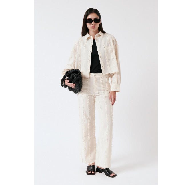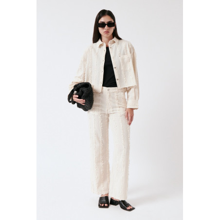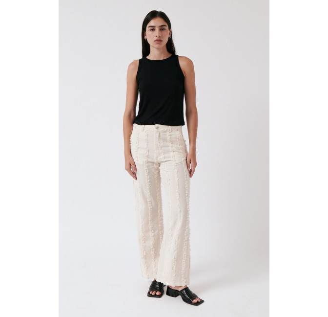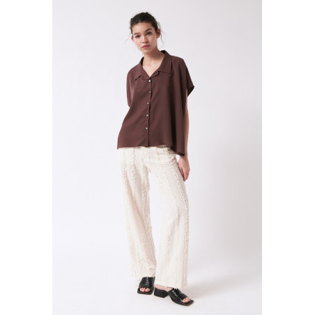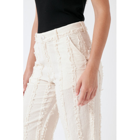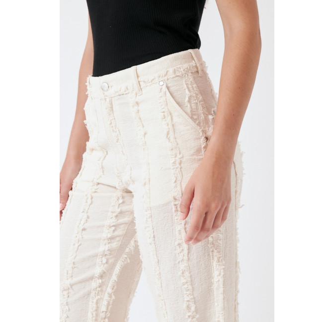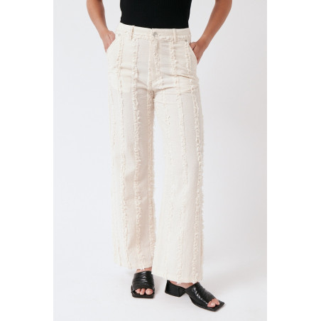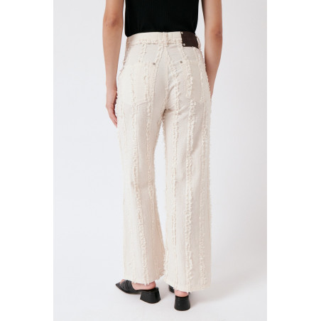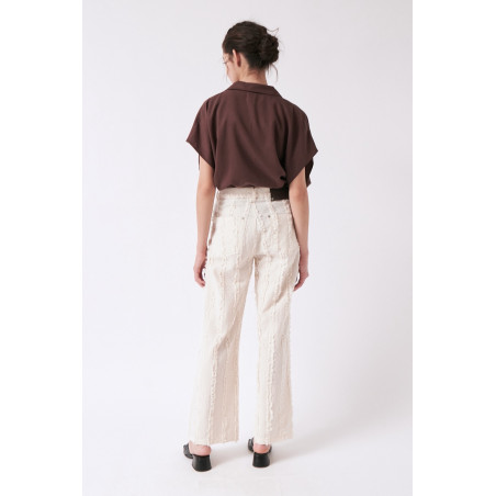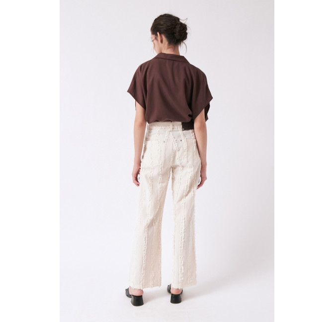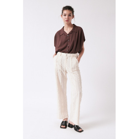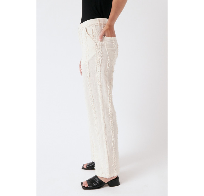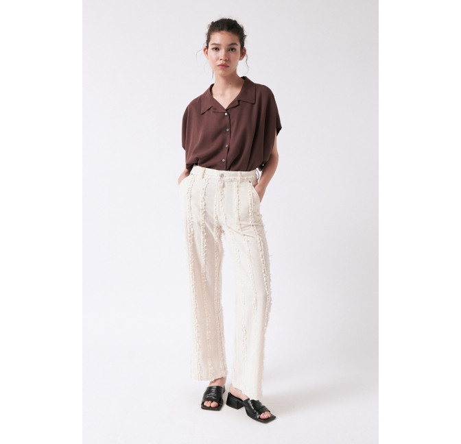 Gerade geschnittene Hose aus einem besonderen, strukturierten und gefransten Baumwollstoff. Die Hose sitzt high waist. Das Material ist leicht, angenehm auf der Haut und dezent transparent. Material: 100% Bio-Baumwolle. Fair hergestellt in Portugal.