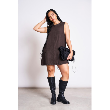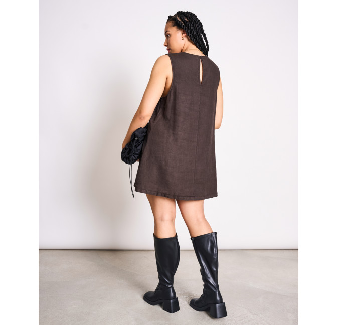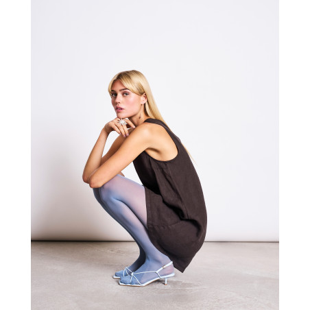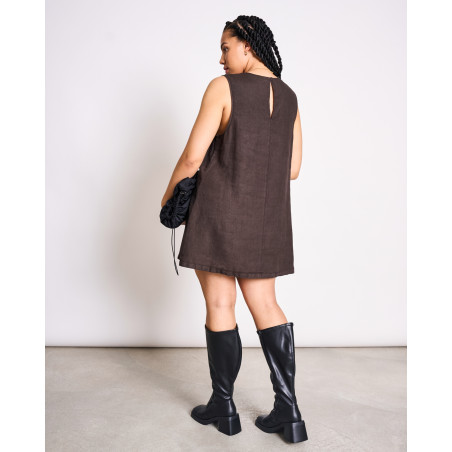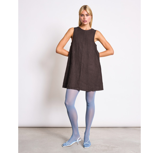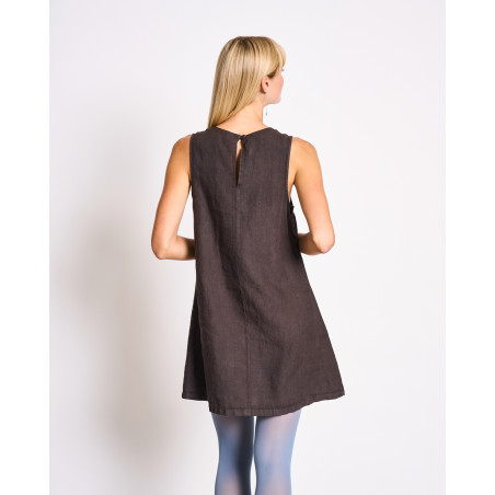 Kurzes Minikleid aus Leinen. Das Kleid hat eine lockere A-Linie und einen Rundhalsausschnitt. Es eignet sich auch super als Layering-Piece über einer Hose. Material: 100% Leinen.