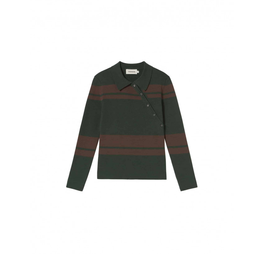 Schmal geschnittener Pullover aus Feinstrick. Mit Polokragen und schräger Knopfleiste. Material: 55% Merinowolle, 45% Bio-Baumwolle. Fair hergestellt in Spanien.