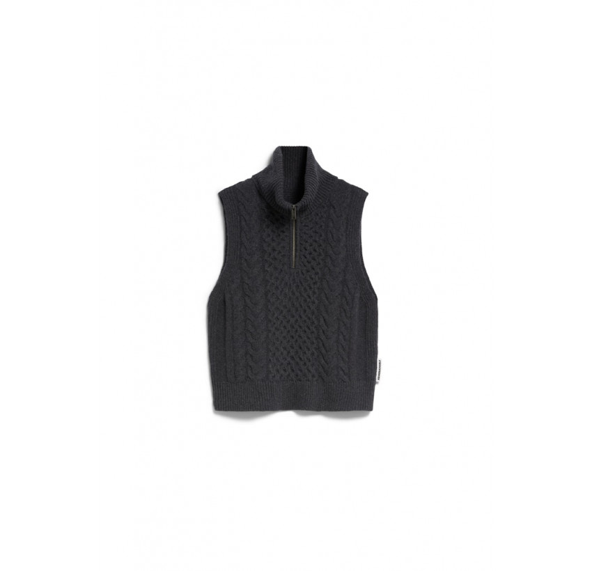 Pullunder mit kurzem Zipper und Stehkragen aus weichem Woll-Mix mit Zopfmuster. Material: 50% Wolle (recycled), 50% Wolle (bio). Fair hergestellt in der Türkei.