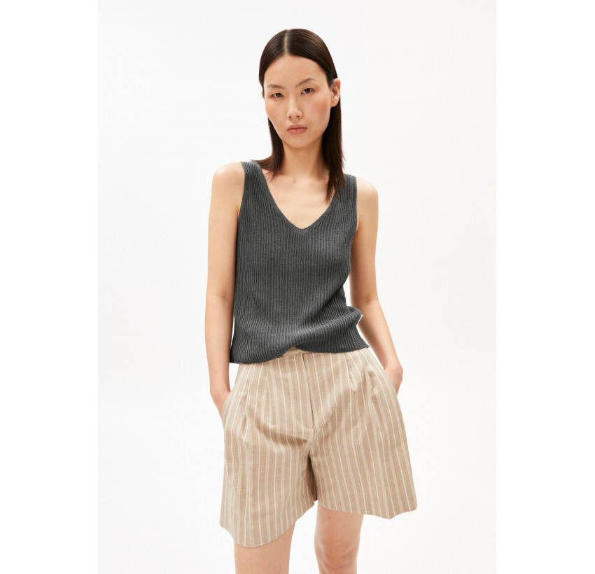 Lockeres Stricktop mit V-Ausschnitt vorne und hinten, aus Leinen-Mix. Material: 40% Leinen, 30% EcoVero® Viskose, 30% Bio-Baumwolle. Fair hergestellt in der Türkei.
